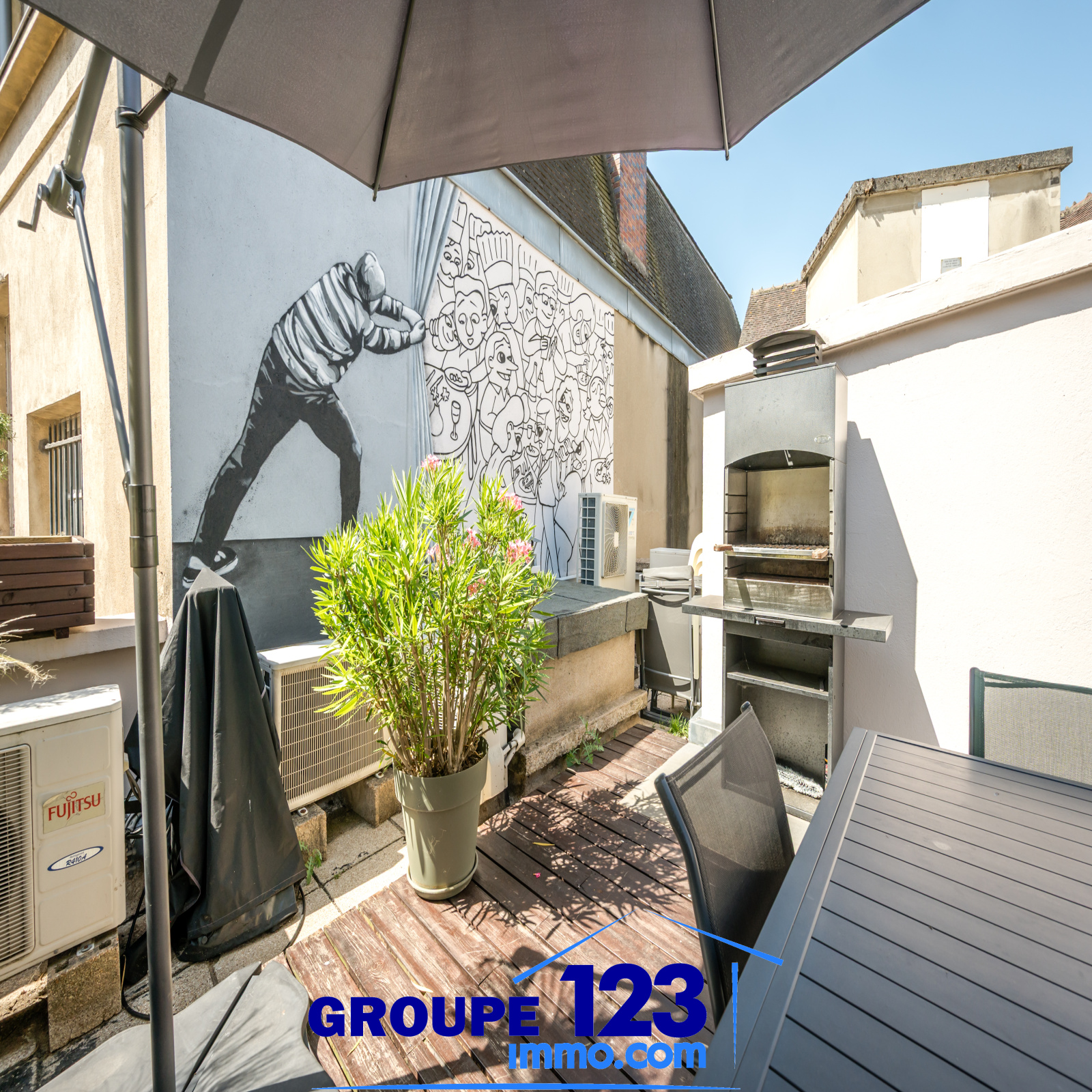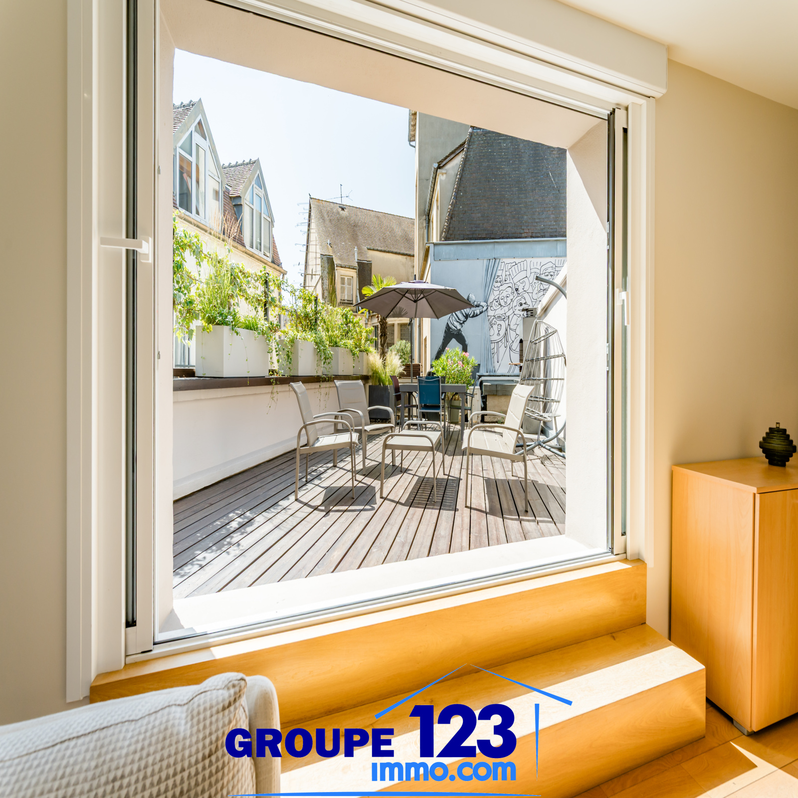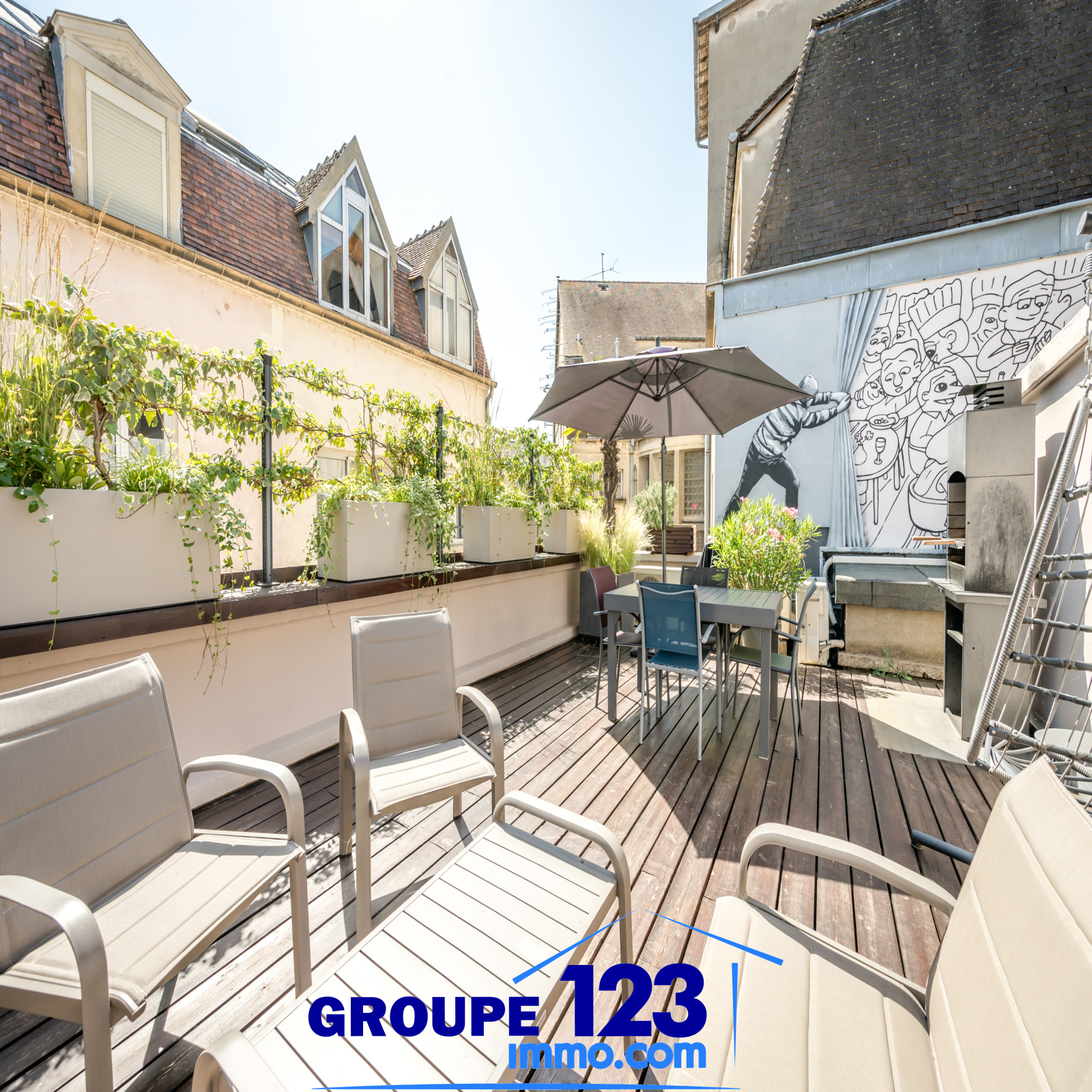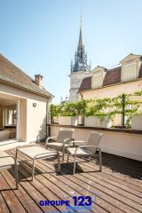 À l’extérieur, la terrasse sublime, véritable refuge en plein centre-ville, signature de ce bien d’exception.