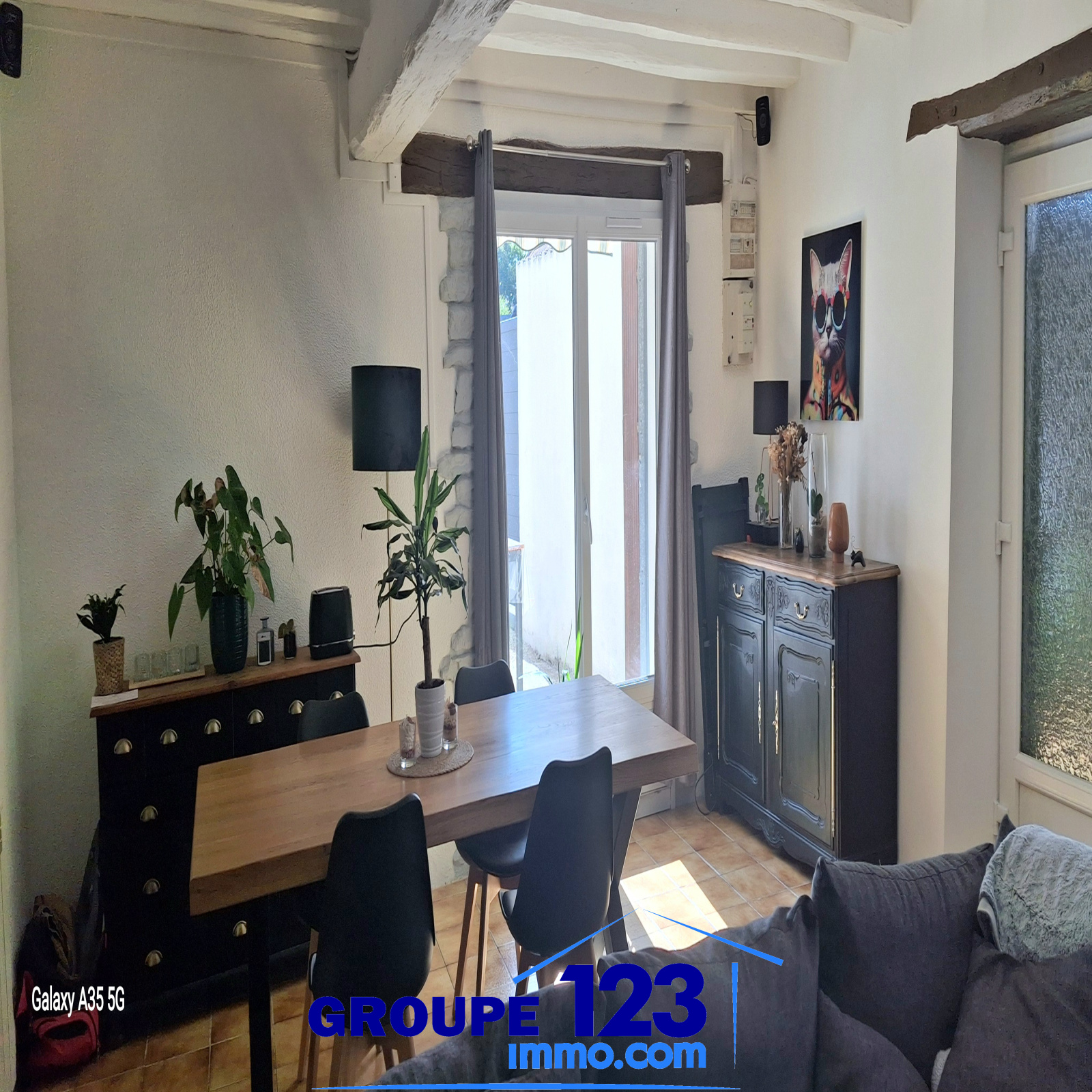 - Salon de 35 m² avec poutres apparentes et cheminée insert bois, offrant chaleur et authenticité. La pièce bénéficie d’un accès direct à la terrasse par une grande porte-fenêtre, idéale pour profiter des beaux jours