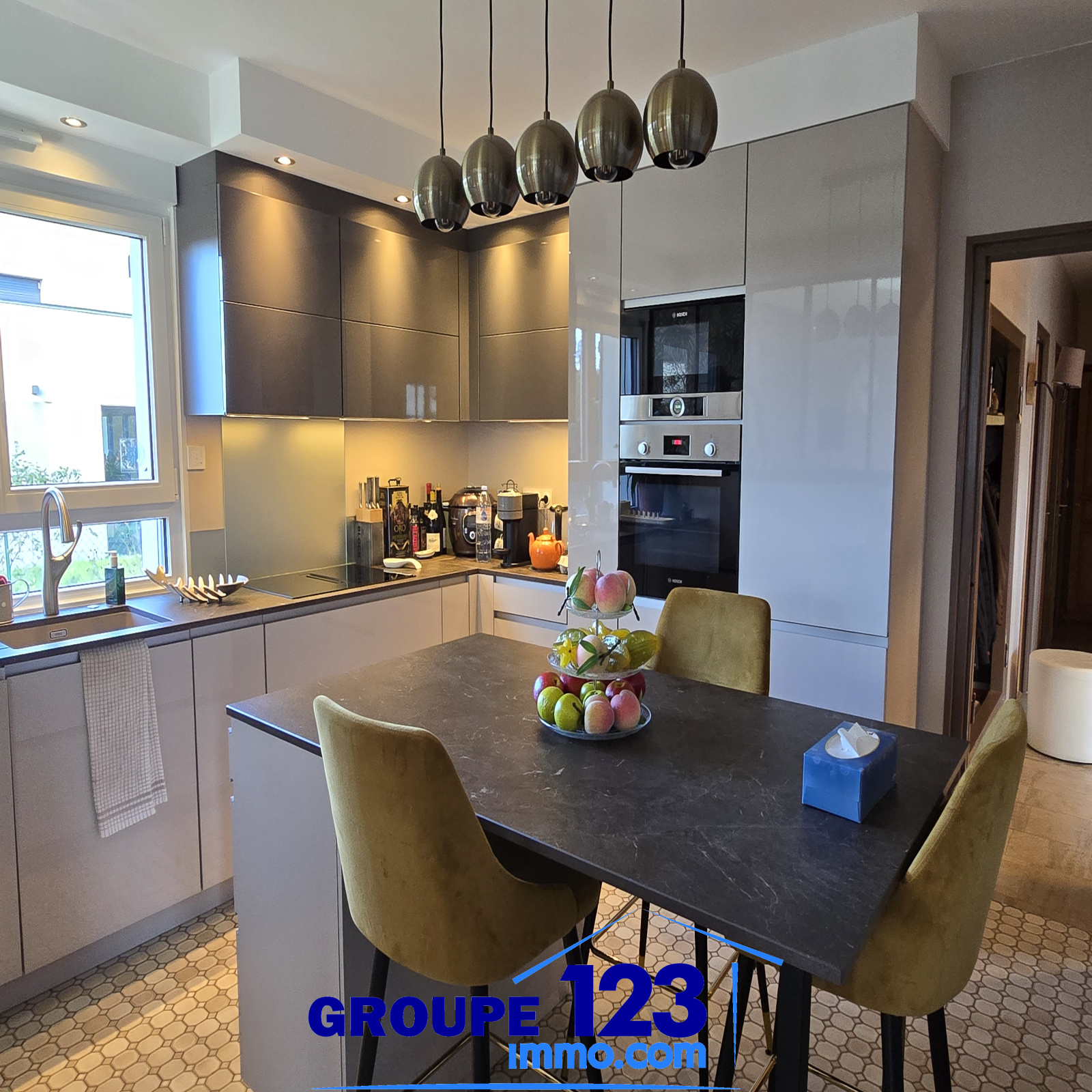 La cuisine, moderne, aménagée et entièrement équipée, s’articule autour d’un îlot central et s’impose comme un espace à la fois fonctionnel et convivial, pensé pour les usages du quotidien.