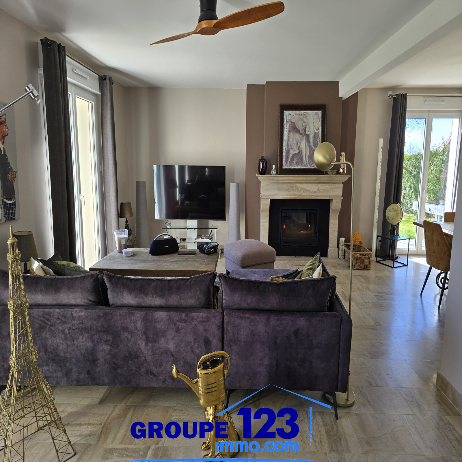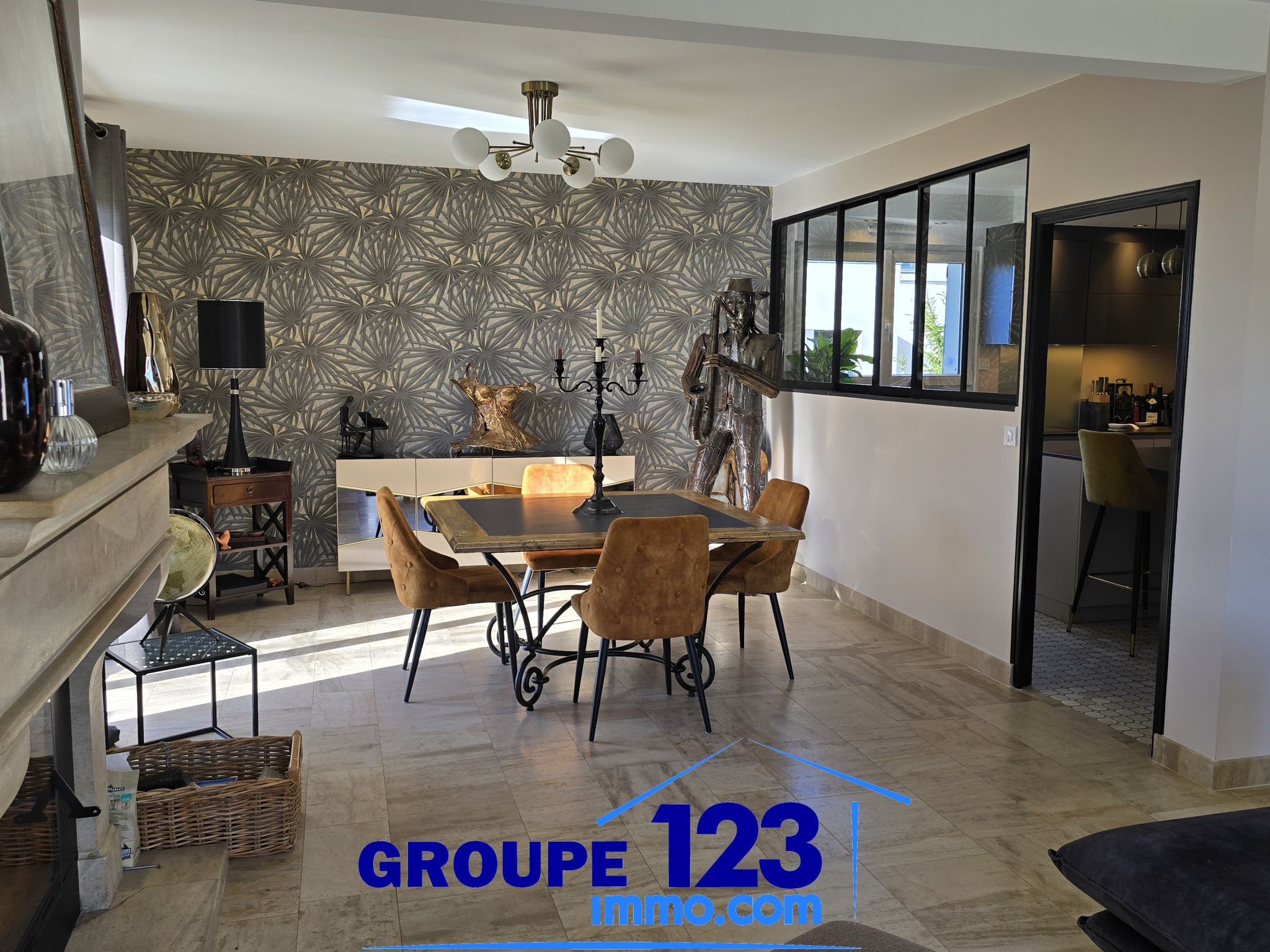 Le rez-de-chaussée accueille un vaste espace séjour / salon, baigné de lumière naturelle, dont l’atmosphère chaleureuse est soulignée par une cheminée avec insert, véritable élément de caractère.